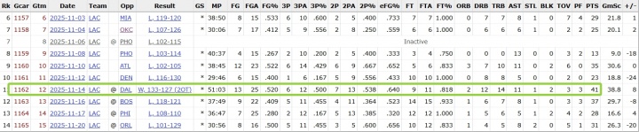 On November 14 (local time), the Clippers defeated the Mavericks in double overtime. Harden played 51 minutes and scored 41 points, 14 rebounds, 11 assists, 1 steal and 1 block.