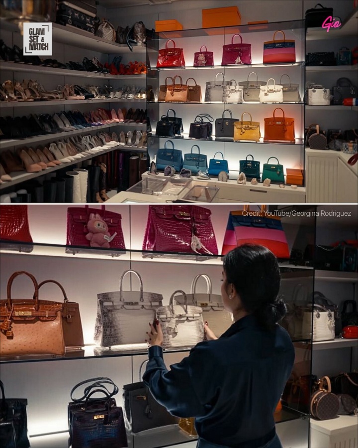 The cloakroom is located in Georgina's luxury apartment in Madrid. The cloakroom contains countless brand-name shoes and bags, the most valuable of which is the 22 Hermès Birkin bag series in the middle.