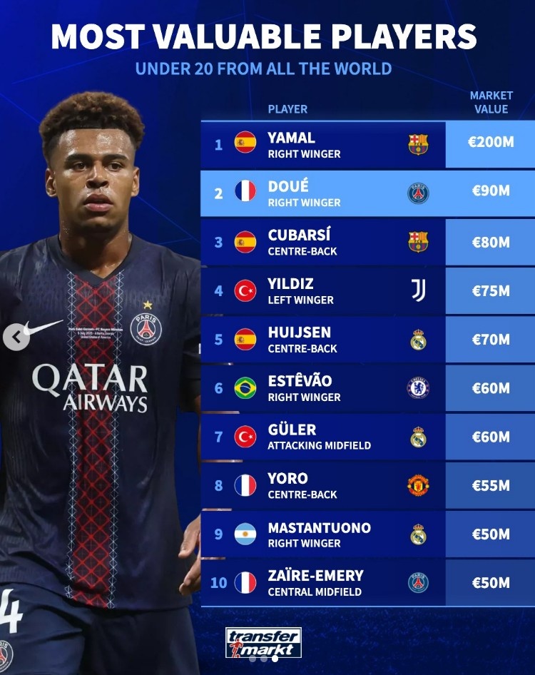 Douai won the Golden Boy Award in 2025. Dezhuan also took stock of the football U20 player value list, as follows:
