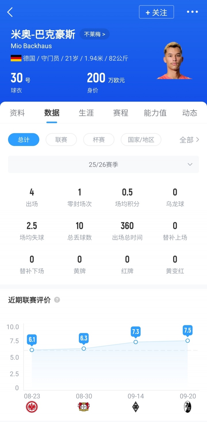 Buckhouse, 21 years old, has become Bremen's main goalkeeper this season. He has played in 4 games, conceded 10 goals, and completed 1 clean sheet. Currently, Germany's turnaround is worth 2 million euros.