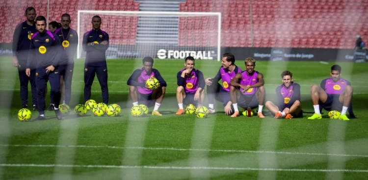 The players were divided into three groups for passing practice, and then played a small game, divided into two teams: those wearing green vests and those without green vests, and the two midfielders (De Jong and Olmo) rotated. The side wearing the green vests are: Ferran Torres, Yamal, Deiro, Kubasi, Christensen, Balde, Casado and Espat. The side not wearing green vests are: Araujo, Eric Garcia (wearing a mask), Rashford, Toni, Bernal, Fermin, Badji, Lewandowski and Torenz.
